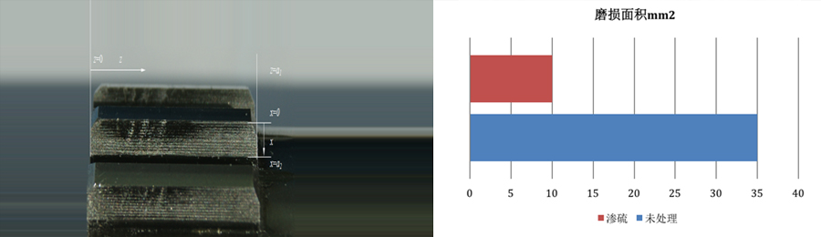 在航空上,花鍵副重載、薄壁、有持續性振動沖擊,工況惡劣;很有必要改善花鍵副齒面磨損嚴重的特性,提高其使用壽命。作為航空上高速重載軸段聯接,TOZERO?滲硫花鍵副磨損斑僅為10mm2,性能提升350%,顯著提高花鍵副耐磨性能。